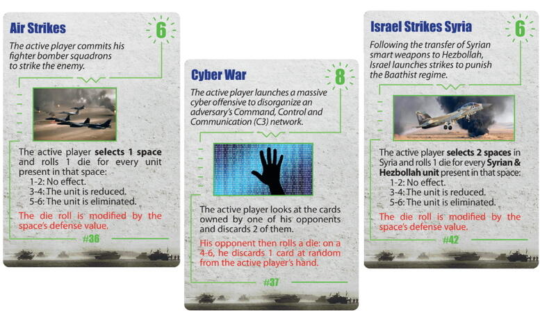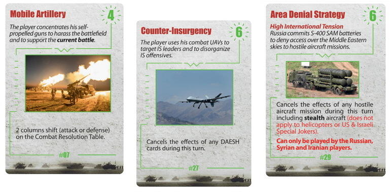 Among 10 historical and hypothetical scenarios, players can simulate the war against the Islamic State in Iraq and Syria (ISIS), the Kurdish Rebellion, the Sunni versus Shia confrontation as well as Russian, Turkish, Israeli and Western intervention in the region. ISIS troops are activated through Event cards.